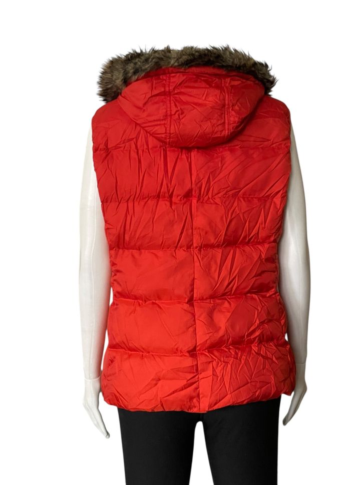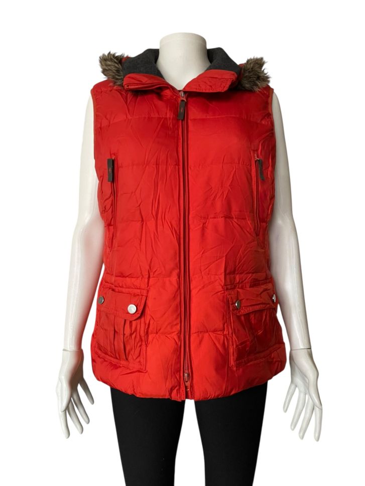 Дамско елече с джобове, копчета, пухкава качулка и ципове METRO L. Има следи от употреба
