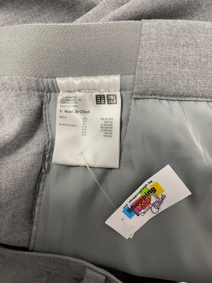 Дамски официален панталон UNIQLO S. Има разминаване между талията (80cm = M, според дамските ни размери) и размера по етикет (S). Препоръчваме ,преди поръчка, да се съобразиш с написаната от нас талия и най-вече с личната ти талия, за да избегнеш разминаване.